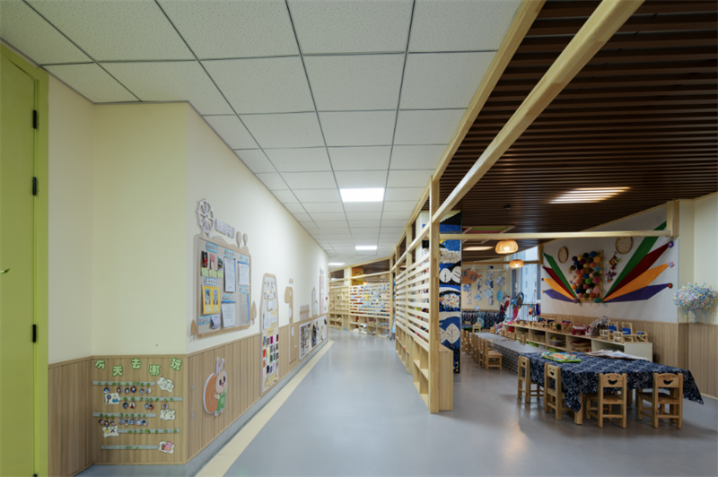 設(shè)計團隊秉承“文化根系·生態(tài)課堂”的核心理念,實現(xiàn)了三大創(chuàng)新突破:文化傳承創(chuàng)新,巧妙解構(gòu)傳統(tǒng)藏式建筑語匯,以象征性的“煨桑臺”形態(tài)塑造入口空間,并運用夯土墻、木質(zhì)格柵等本土材料與工藝,喚醒地域文化記憶。生態(tài)教育融合,充分利用場地自然高差,構(gòu)建多層級生態(tài)活動圈。設(shè)置屋頂農(nóng)場、戲水溪谷、觀星臺等多元互動空間,鋪設(shè)出一條“從土壤到星空”的自然認知與探索路徑。兒童友好設(shè)計,深度契合3-6歲兒童行為特征,引入模塊化家具系統(tǒng),并融入光影劇場、交互藝術(shù)墻等智慧化設(shè)施,充分激發(fā)幼兒的好奇心、探索精神與創(chuàng)造力。